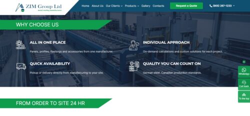 Проєкт ZIM Group — це сучасний корпоративний сайт для компанії з Канади, реалізований на CMS WordPress. Сайт поєднує презентацію бізнесу, каталог продукції та мультимедійний контент.