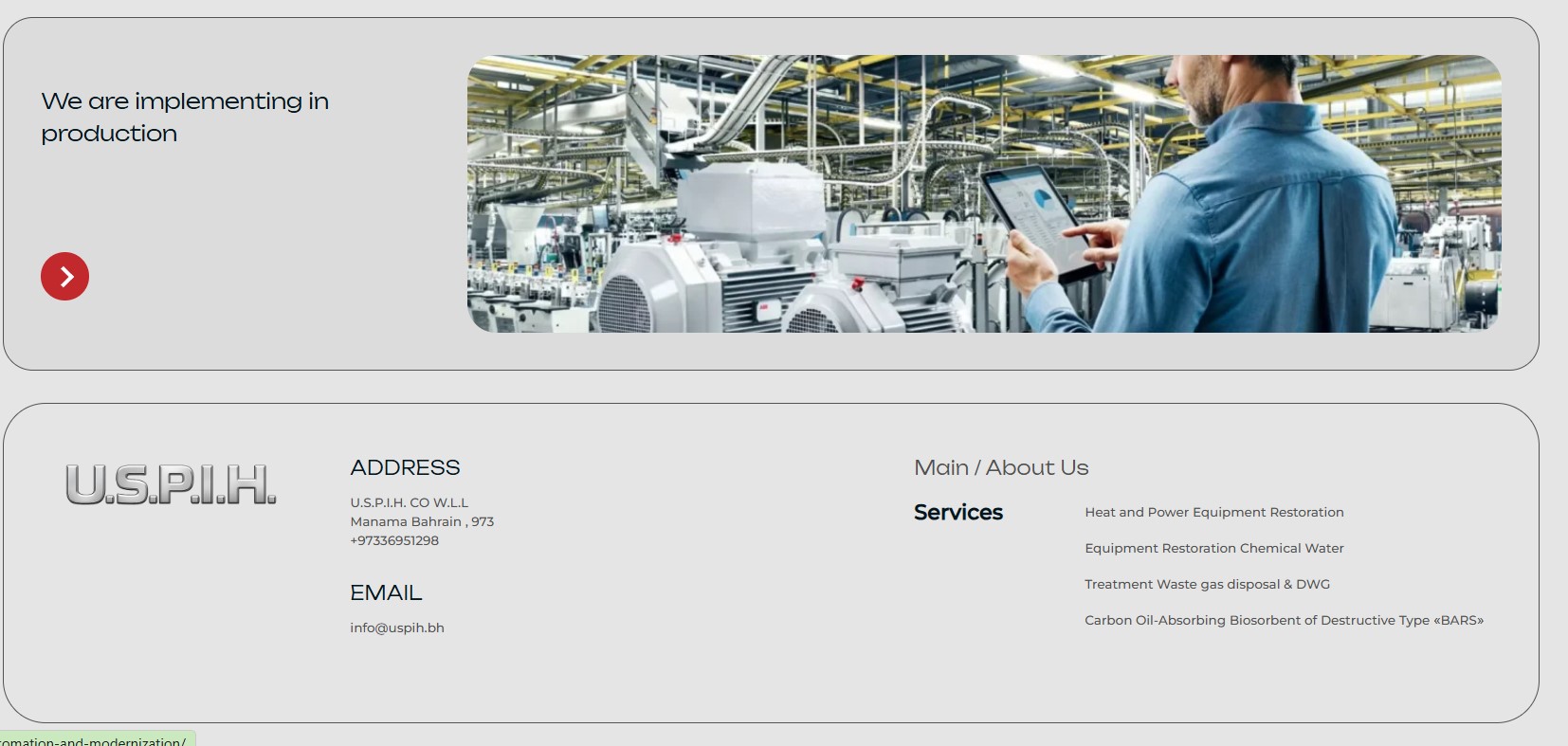 Сайт uspih.bh создан для компании U.S.P.I.H. CO W.L.L., работающей в секторе индустриального инжиниринга и энергетических решений в Бахрейне. Проект выполнен с акцентом на профессиональную презентацию услуг, опыта и технологических направлений деятельности.